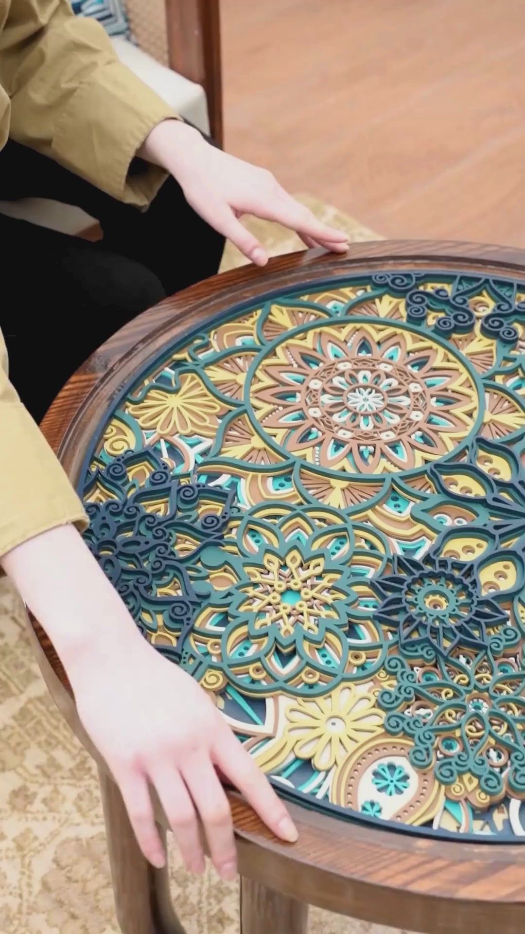The Vivid Harmony Mandala Table is a striking fusion of artisanal craft and sculptural design, featuring a multi-layered "Vivid Harmony" mandala encased beneath a sleek glass top. Its rich teal and ochre wooden layers create a mesmerizing 3D depth, beautifully framed by a warm walnut-toned rim and supported by four unique, U-shaped bentwood legs. This piece serves as both a functional coffee table and a meditative work of art, bringing a balanced, bohemian elegance to any contemporary living space.